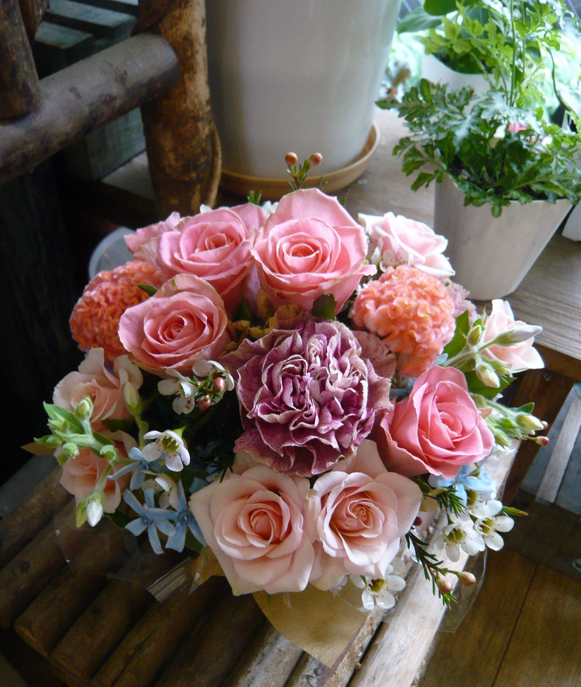 季節の花をぎゅっとまとめて作ったコンパクトなフラワーアレンジメント